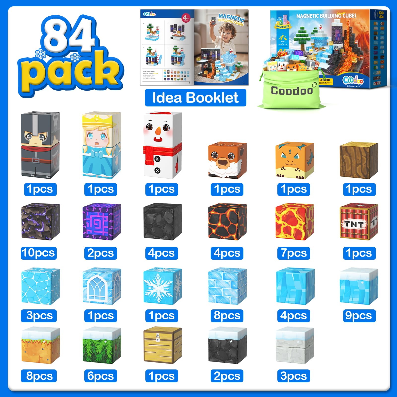 Frozen Castle & Lava Kindom: Explore two magical worlds with our 84-piece Magnetic Block Set, Build icy castles with knights and princesses or fiery lava lands with dragons and volcanoes. Perfect for fans of frozen toys, this set sparks creativity and role-plays endless adventures